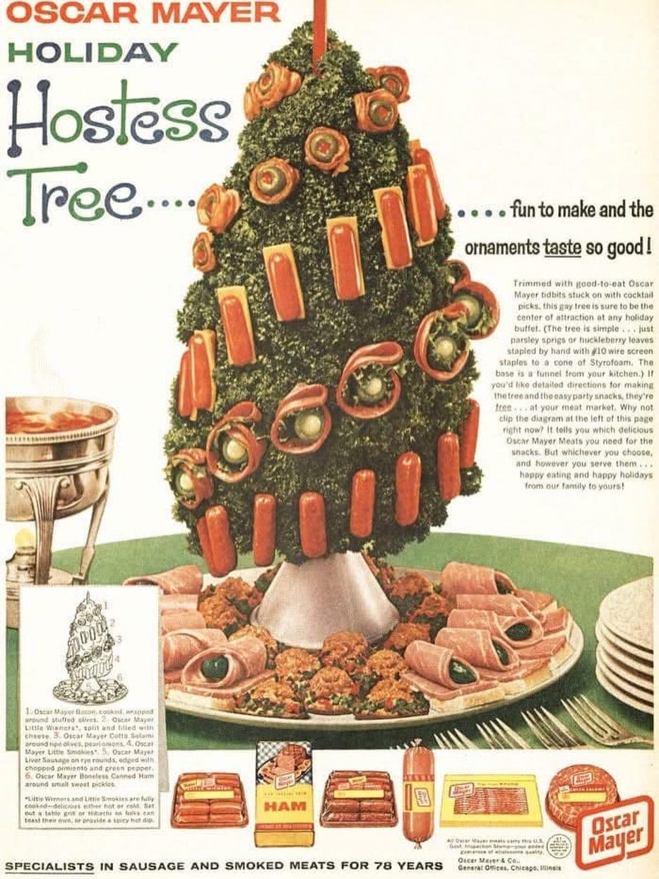 Then contemplate the Oscar Mayer Hostess Holiday Meat Tree. The “ornaments taste so good!” Pure nightmare fuel.