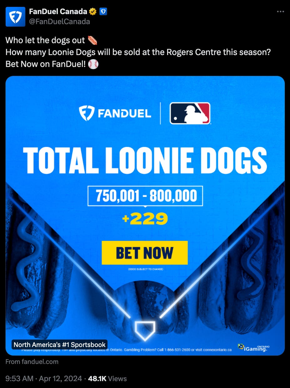 +229? Okay, should we be betting on the amount of hot dogs during the Blue Jays Loonie Dog Nights this season? And it’s crazy that on Tuesday 31,175 fans ate 59,831 hotdogs - a 1.92 per fan clip. And why not. As one Xer noted, “man Ippei would’ve loved it here.” Meanwhile, if you think betting is everywhere, Business Insider hit the world with a big piece titled, “The big new way to get rich.”