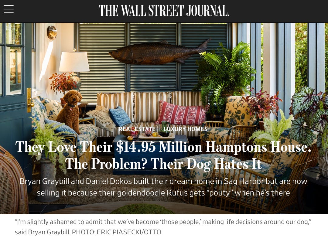 Is this article the one that triggers me into getting a Wall Street Journal subscription? Just look at that smug dog. I would watch a Summer House spin off that was centered around jerk dogs who torment their ultra-rich owners. As one funny X post suggested stories like this mean, “we need another 500 bps of rate hikes.”