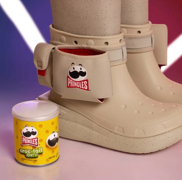 It’s slim pickings this week. This phrase only reminds how great the actor Slim Pickens was. Where was I? Oh right, things I hate. Another activation at Coachella was this Crocs x Pringles collab abomination. Ashlee Simpson and her husband were seen repping these ridiculous things via Talk of the Internet - another fun newsletter I’ve got on my radar.